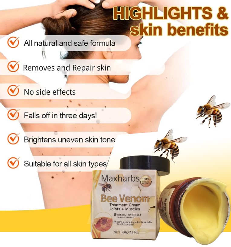 Β Venom Treatment CreamΒ offers a solution by leveraging the powerful attributes of bee venom to specifically address diverse skin irregularities like skin tags, moles, warts, and blemishes. Enriched with active components derived from bee venom, this advanced formulation works to dissolve and delicately eliminate undesirable growths.