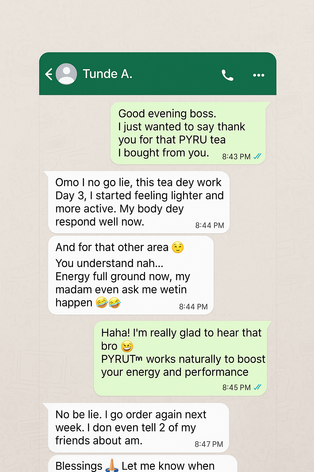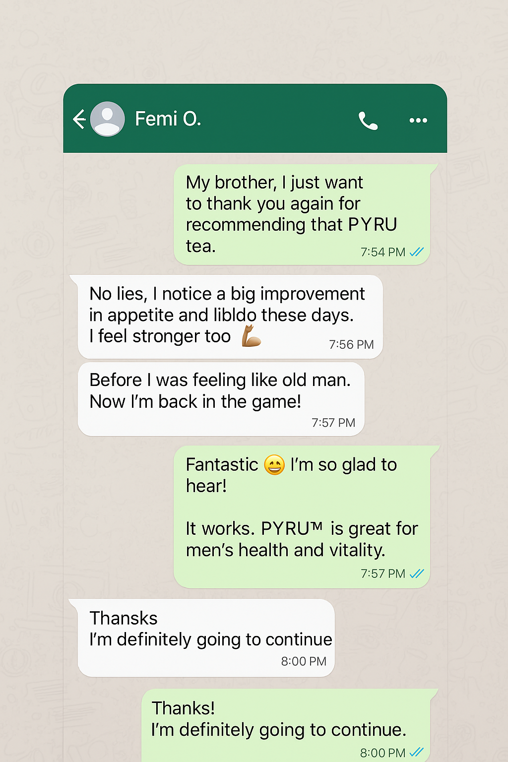 “I honestly didn’t expect much at first, but by the 5th day, I started waking up with more energy. By the second week, I felt lighter, more alert, and I noticed I wasn’t dragging myself out of bed anymore. What shocked me most was the change in my libido—it felt like I was in my twenties again. My confidence came back, my wife noticed the difference, and even at work, I was more focused and motivated. The tea tastes great, and I like that it’s all natural. It’s now a part of my daily routine.”